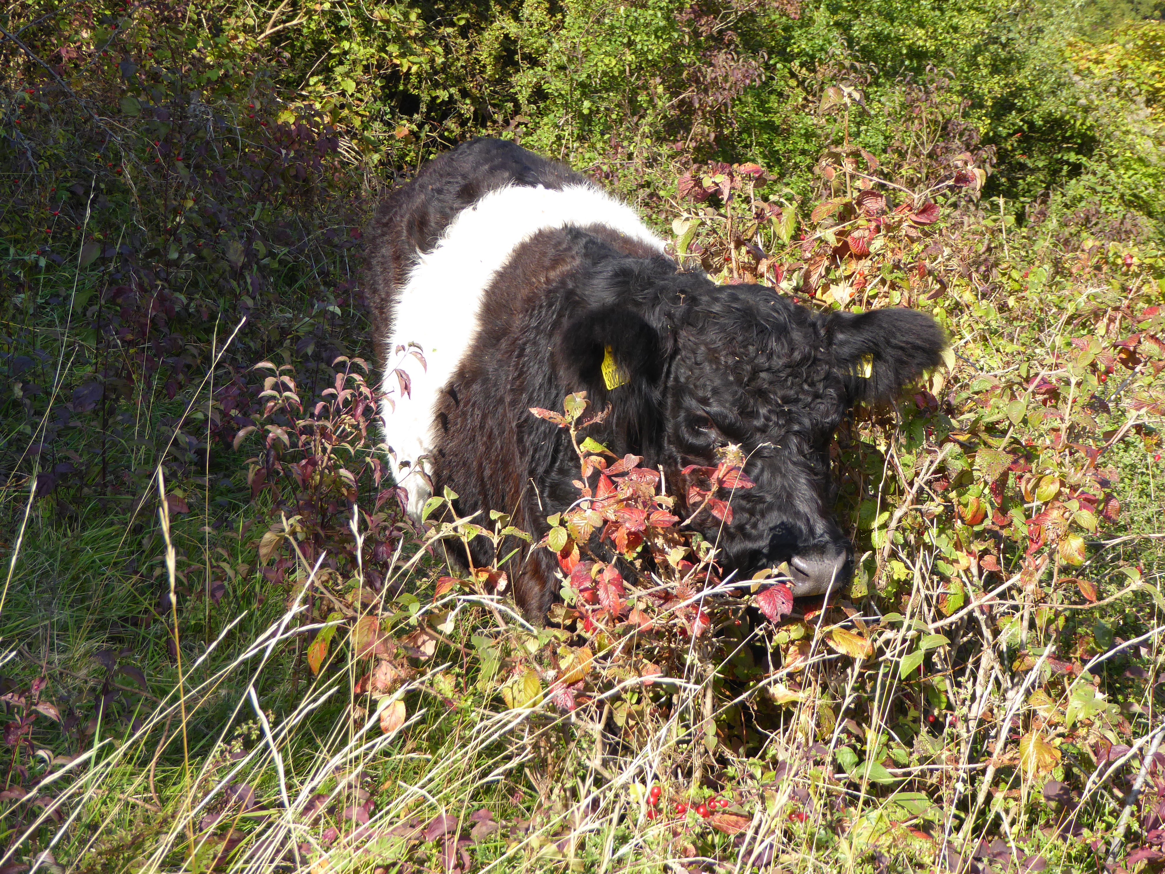 The Belties are back! Autumn has arrived on Box Hill and the cattle have returned to take over the grassland conservation work. Look out for them in the Zig Zag valley (14 of them) and Lower Viewpoint (just 6). Not that this means the Box Hill NT volunteers can now take it easy as there is still plenty of work to do. The Belties are just a little fussy over what they eat so the volunteers have been tasked with getting rid of the nasty prickly hawthorn and other scrub that the cattle won’t touch before they move into their new areas. Scrub clearance work has already been finished on the slopes above the old Military Road (bearing in mind that the objective is to thin it out not completely remove it) and work has started on Dukes. It’s all a balance between clearance and leaving enough for the invertebrates to have shelter over winter.